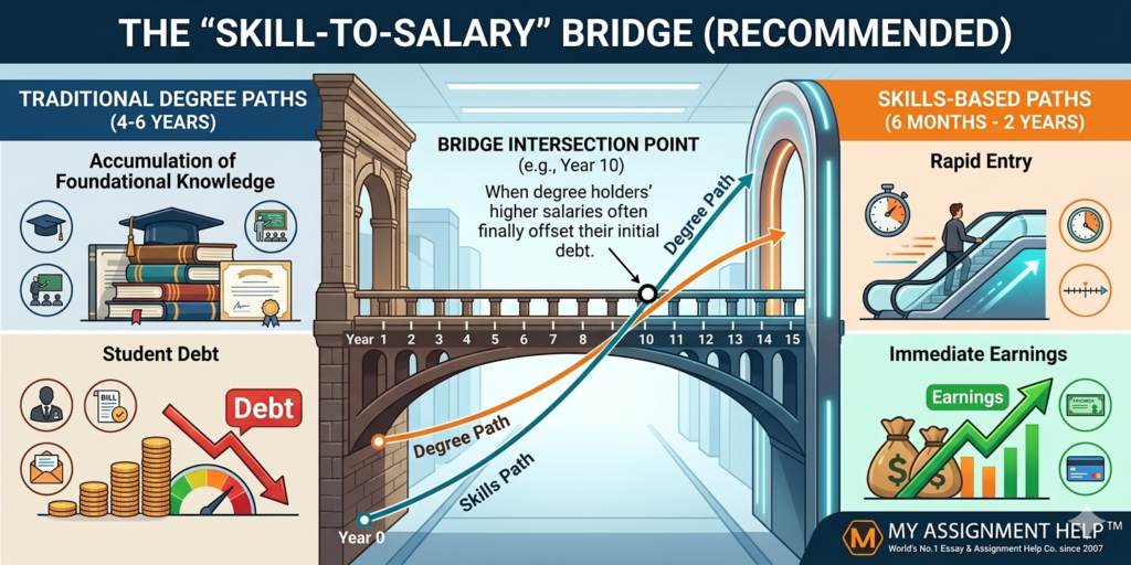 - The 10-Year Advantage: Trade schools often provide a better financial foundation in the first decade, though degrees typically catch up in lifetime earnings by age 35.